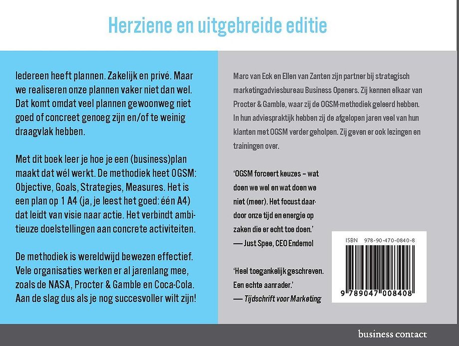 Meer over de auteursIedereen heeft plannen, maar we realiseren ze vaker niet dan wel. Dat komt omdat veel plannen gewoonweg niet goed of concreet genoeg zijn en/of te weinig draagvlak hebben. Met dit boek leer je hoe je een (business)plan maakt dat wél werkt.