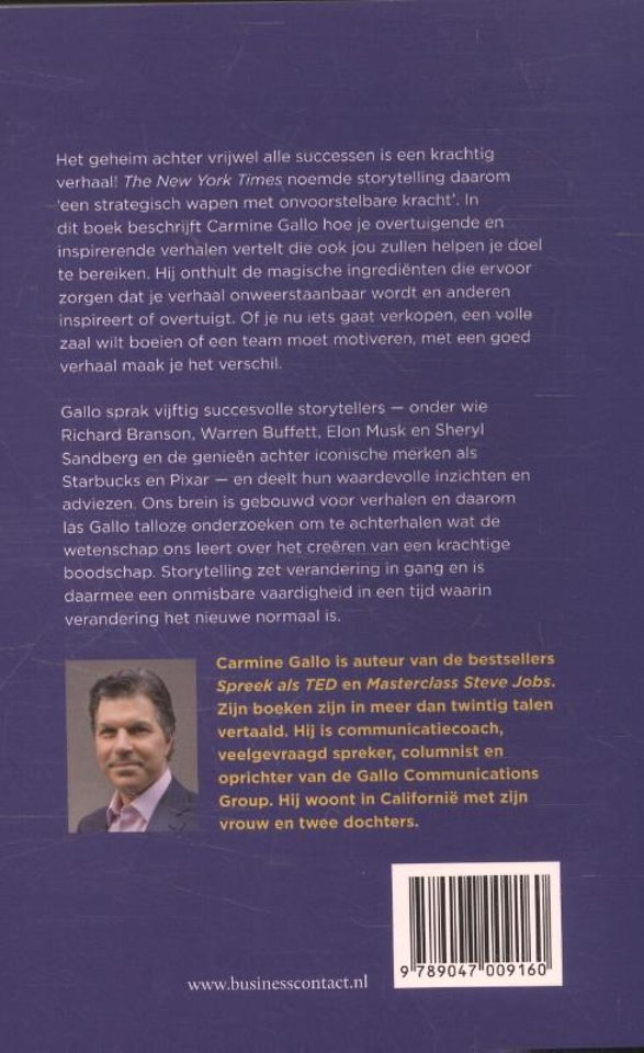 Gallo sprak vijftig succesvolle storytellers – onder wie Richard Branson, Warren Buffett, Elon Musk en Sheryl Sandberg en de genieën achter iconische merken als Starbucks en Pixar – en deelt hun waardevolle inzichten en adviezen. Ons brein is gebouwd voor verhalen en daarom las Gallo talloze onderzoeken om te achterhalen wat de wetenschap ons leert over het creëren van een krachtige boodschap. Storytelling zet verandering in gang en is daarmee een onmisbare vaardigheid in een tijd waarin verandering het nieuwe normaal is.