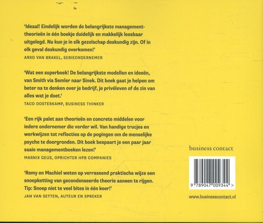 'Eindelijk worden de belangrijkste managementtheorieën in één boekje duidelijk en makkelijk leesbaar uitgelegd. Nu kun je in elk gezelschap deskundig zijn. Of in elk geval deskundig overkomen!' – Arko van Brakel, serieondernemer