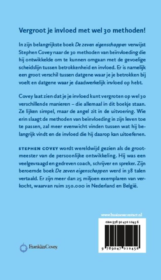 Stephen Covey laat zien dat je je invloed kunt vergroten op wel 30 verschillende manieren – die allemaal in dit boekje staan. Ze lijken simpel, maar de angel zit in de uitvoering. Wie erin slaagt de methoden van beïnvloeding in zijn leven toe te passen, zal meer evenwicht vinden tussen wat hij belangrijk vindt en de invloed die hij daarop kan uitoefenen.