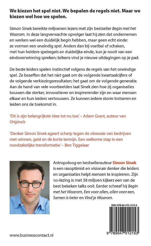 Simon Sinek bereikte miljoenen lezers met zijn bestseller ‘Begin met het Waarom’, nu is er de langverwachte opvolger 'Het oneindige spel'. In ‘Het oneindige spel’ laat Sinek zien dat ondernemen en werken wel een duidelijk begin hebben, maar geen echt einde: ze vormen een oneindig spel. Anders dan bij voetbal of schaken, met hun heldere spelregels en duidelijke einde, kun je nooit van een eindoverwinning spreken; telkens vind je nieuwe uitdagingen op je pad.