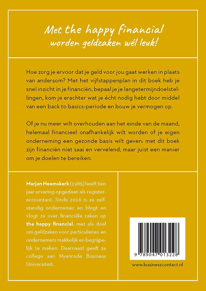 In ‘The happy financial’ laat Marjan Heemskerk je zien hoe je ervoor kan zorgen dat geld voor jou gaat werken in plaats van andersom. Met het vijfstappenplan in dit boek heb je snel inzicht in je financiën, bepaal je je langetermijndoelstellingen, kom je erachter wat je écht nodig hebt door middel van een back to basics-periode en bouw je vermogen op.