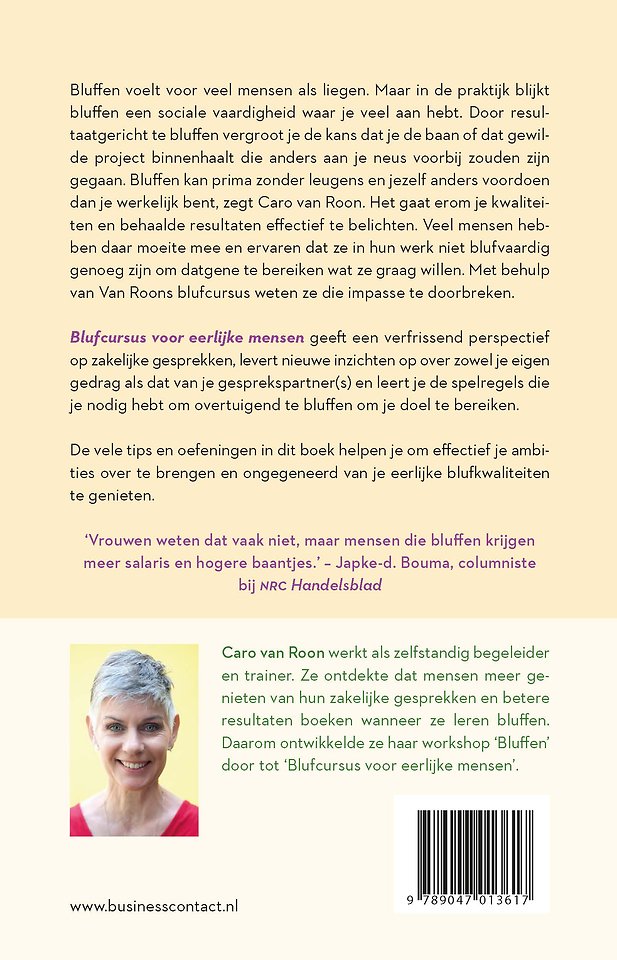 In 'Blufcursus voor eerlijke mensen' rekent Caro van Roon af met het beeld dat je moet liegen om te bluffen. Bluffen is een sociale vaardigheid waar je veel aan hebt. Door resultaatgericht te bluffen vergroot je de kans dat je de baan, die ene opdracht of dat gewilde project wél binnenhaalt. En dat kan prima zonder te liegen en jezelf anders voor te doen dan je werkelijk bent.
