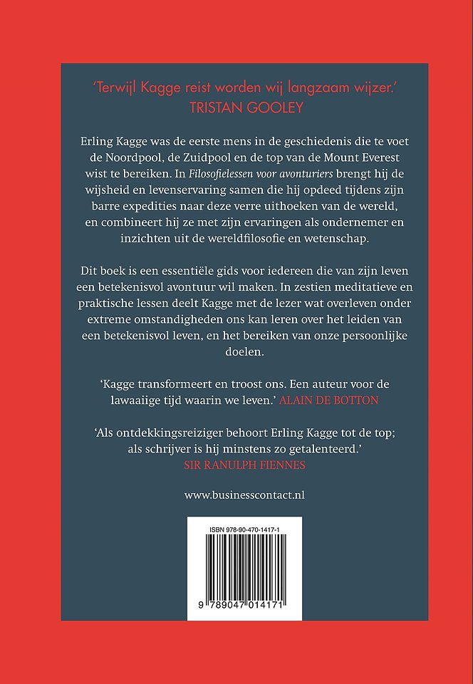 Meer over Erling KaggeErling Kagge brengt in ‘Filosofielessen voor avonturiers’ de wijsheid en levenservaring samen die hij opdeed als eerste mens in de geschiedenis die te voet de Noordpool, de Zuidpool en de top van de Mount Everest bereikte. Zijn ervaringen die hij opdeed tijdens de barre expedities naar deze verre uithoeken van de wereld, combineert hij in dit boek met zijn ervaringen als ondernemer en inzichten uit de wereldfilosofie en wetenschap.