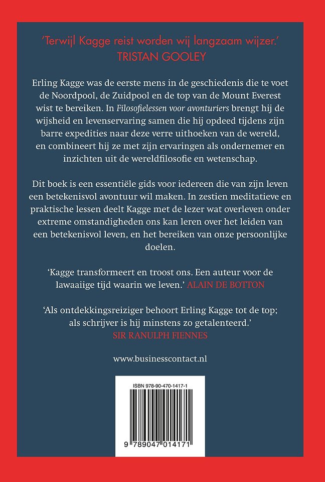 Meer over Erling KaggeErling Kagge brengt in ‘Filosofielessen voor avonturiers’ de wijsheid en levenservaring samen die hij opdeed als eerste mens in de geschiedenis die te voet de Noordpool, de Zuidpool en de top van de Mount Everest bereikte. Zijn ervaringen die hij opdeed tijdens de barre expedities naar deze verre uithoeken van de wereld, combineert hij in dit boek met zijn ervaringen als ondernemer en inzichten uit de wereldfilosofie en wetenschap.