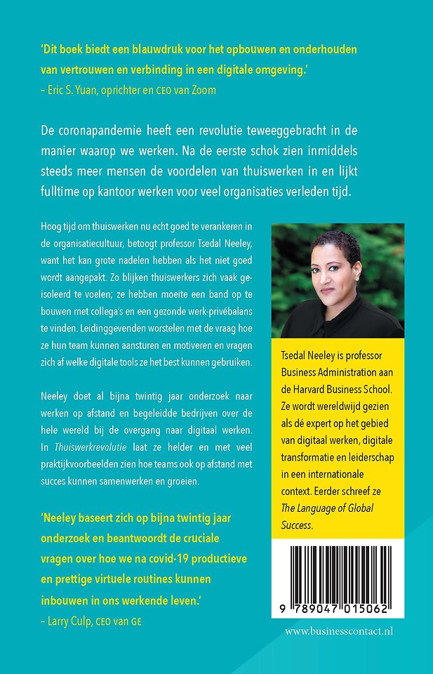 Neeley doet al bijna twintig jaar onderzoek naar werken op afstand en begeleidde bedrijven over de hele wereld bij de overgang naar digitaal werken. In 'Thuiswerkrevolutie' laat ze helder en met veel praktijkvoorbeelden zien hoe teams ook op afstand met succes kunnen samenwerken en groeien.