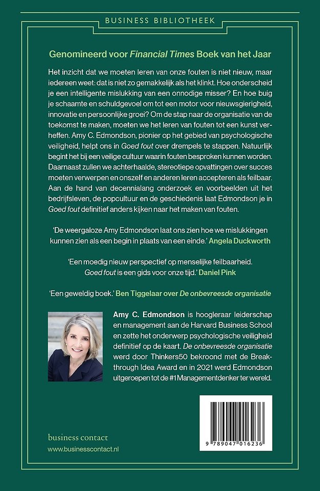 Meer over Amy EdmondsonDe volgende stap naar de organisatie van de toekomst is er een waarin leren van fouten tot een kunst verheven is. Amy Edmondson, de grondlegger van psychologische veiligheid, helpt ons die drempel over. Dat we van onze fouten moeten leren omdat het goed is voor innovatie en persoonlijke groei lijkt evident maar is niet zo gemakkelijk als het klinkt.