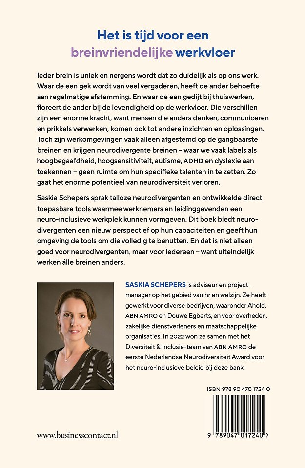 Saskia Schepers sprak talloze neurodivergenten, leidinggevenden en hr-managers en ontwikkelde direct toepasbare tools, zoals het breinpaspoort en de samendenksessie, waarmee werknemers en leidinggevenden een neuro-inclusieve werkplek kunnen vormgeven.