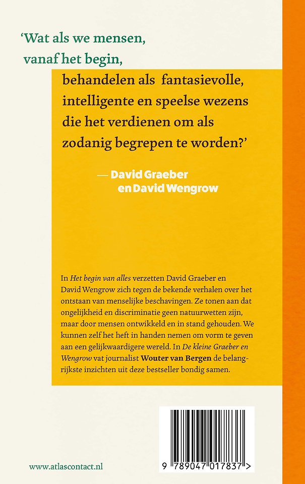In de postuum uitgegeven bestseller 'Het begin van alles' verzet hij zich tegen de bekende verhalen over het ontstaan van menselijke beschavingen. Hij toont aan dat ongelijkheid en discriminatie geen natuurwetten zijn, maar door mensen ontwikkeld en in stand gehouden. En als dat zo is, dan kunnen we zelf het heft in handen nemen om vorm te geven aan een gelijkwaardigere wereld.