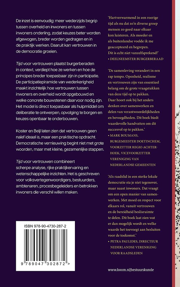 Tijd voor vertrouwen combineert scherpe analyse, rijke praktijkervaring en wetenschappelijke inzichten. Het is geschreven voor volksvertegenwoordigers, bestuurders, ambtenaren, procesbegeleiders en betrokken inwoners die verschil willen maken.