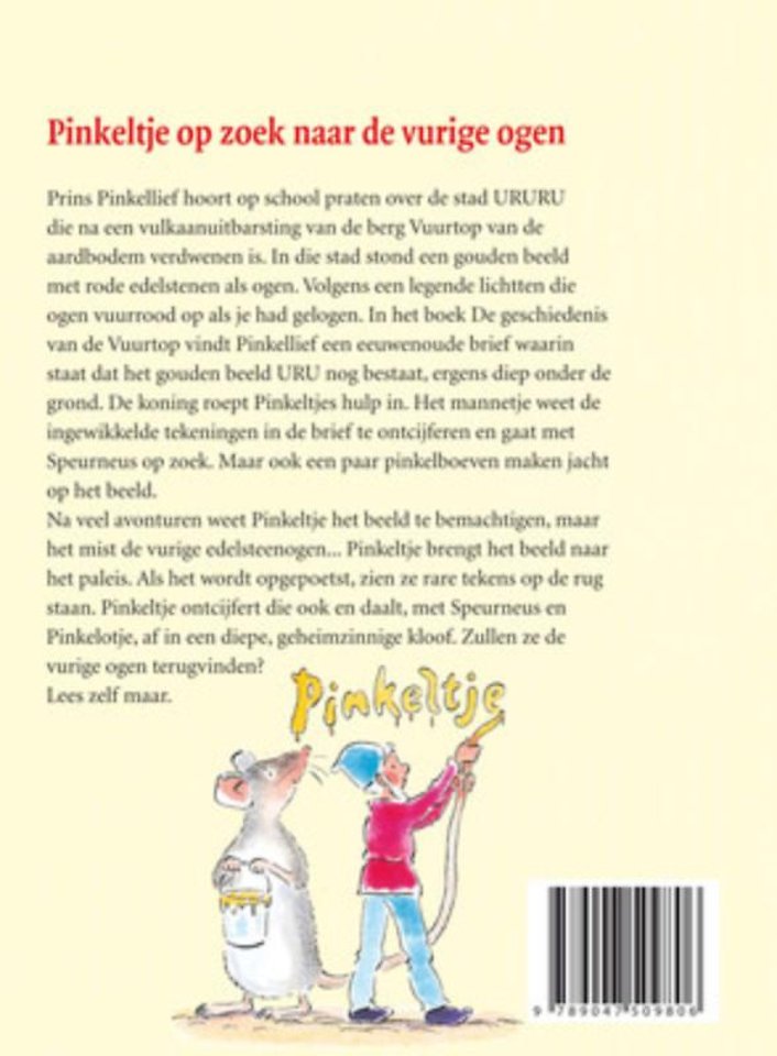 Pinkeltje brengt het beeld naar het paleis. Als het wordt opgepoetst, zien ze rare tekens op de rug staan. Pinkeltje ontcijfert die ook en daalt, met Speurneus en Pinkelotje, af in een diepe, geheimzinnige kloof. Zullen ze de vurige ogen terugvinden? Lees zelf maar!