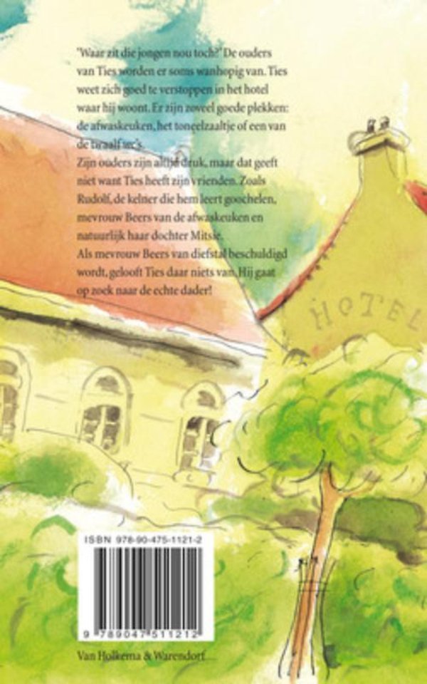 'Waar zit die jongen toch?' De ouders van Ties worden er soms wanhopig van. Ties weet zich goed te vertsoppen in het hotel waar hij woont. Er zijn zoveel goede plekken: de afwaskeuken, het toneelzaaltje of een van de twaalf wc's. Zijn ouders zijn altijd druk, maar dat geeft niet want Ties heeft zijn vrienden. Zoals Rudolf, de kelner die hem leert goochelen, mevrouw Beers van de afwaskeuken en natuurlijk haar dochter Mitsie. Als mevrouw Beers van diefstel beschuldigd wordt, gelooft Ties daar niets van. Hij gaat op zoek naar de echte dader!