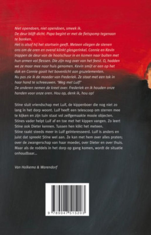 Niet opendoen, niet opendoen, smeek ik. De deur blijft dicht. Papa begint er met de fietspomp tegenaan te bonken. Het is alsof hij het startsein geeft. Meteen vliegen de stenen ons om de oren en overal klinkt glasgerinkel. Connie en Kevin trappen de deur van de hooischuur in en komen naar buiten met hun armen vol flessen. Die zijn nog over van het feest. O, hadden we ze maar mee naar huis genomen. Kevin smijt er een op het dak en Connie gooit het bovenlicht aan gruzelementen. Nu pas zie ik de moeder van Frederiek. Ze staat met een tak in haar hand te schreeuwen. �Weg met Luif!� De anderen nemen de kreet over. Frederiek en ik houden onze handen voor onze oren. Hou op, denk ik, hou op!