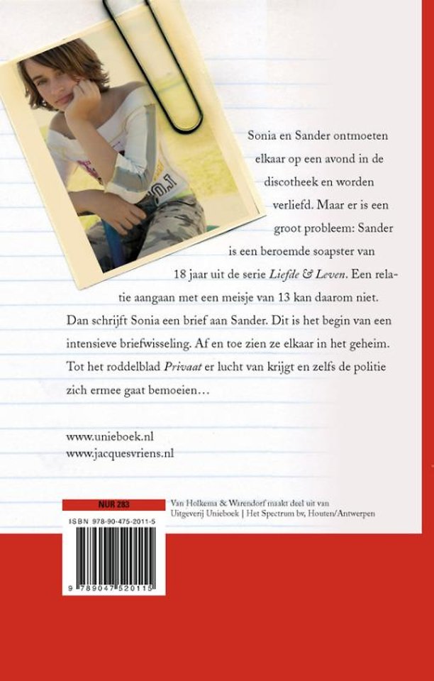 De 13-jarige Sonia is hopeloos verliefd op de 18-jarige soapster Sander. Het is wederzijds, maar vanwege Sonia's leeftijd en Sanders carriere moet de relatie geheim blijven. Een intensieve briefwisseling met af en toe een geheime ontmoeting is het gevolg. Totdat een roddelblad er lucht van krijgt. Onafhankelijk te lezen vervolg op 'P.S. Ik ben uw dochter'*. Door middel van de correspondentie leer je de gevoelens van beide hoofdpersonen kennen; Sonia die geen blad voor d'r mond neemt, die tot het uiterste gaat met betrekking tot de liefde, haar gevoelens ten aanzien van het tehuis waarin ze woont en het eventuele pleeggezin; en de opvliegende Sander die, hoewel verliefd, kiest voor z'n carriere en bang is dat z'n niet brandschone verleden uitkomt met alle gevolgen van dien.