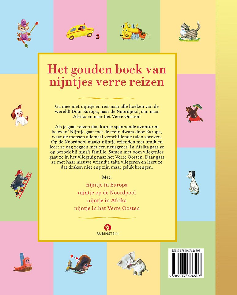 Ga mee met nijntje en reis naar alle hoeken van de wereld! Door Europa, naar de Noordpool, dan naar Afrika en naar het Verre Oosten! Als je gaat reizen dan kun je spannende avonturen beleven! Nijntje gaat met de trein dwars door Europa, waar de mensen allemaal verschillende talen spreken. Op de Noordpool maakt nijntje vrienden met umik en leert ze dag zeggen met een neusgroet! In Afrika gaat ze op bezoek bij nina’s familie. Samen met oom vliegenier gaat ze in het vliegtuig naar het Verre Oosten. Daar gaat ze met haar nieuwe vriendje taka vliegeren en leert ze dat draken niet eng zijn maar geluk brengen.