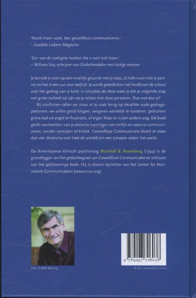 We komen allemaal weleens in situaties als deze terecht en maar al te vaak vallen we dan terug op dezelfde oude gedragspatronen: we willen gelijk krijgen, weigeren werkelijk te luisteren, gebruiken grove taal uit angst en frustratie, of erger. Maar er is een andere weg. Dit boek geeft lezers praktische training in het toepassen van principes van Geweldloze Communicatie, niet alleen op het persoonlijke vlak maar ook op maatschappelijk niveau. Het is een bijzonder effectieve manier om conflicten op te lossen, met woede om te gaan en naar verzoening te streven.