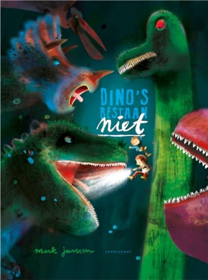 Met zijn eerste eigen prentenboek, Niets gebeurd, veroverde Mark Janssen binnen- en buitenland. In dezelfde gedurfde, sprankelende stijl vertelt Mark nu het verhaal over twee broertjes die op dinojacht gaan. Nou ja, de oudste en meest stoere broer doet alsof, maarvoor de jongste is het allemaal heel serieus. En terecht! Hij ziet wat zijn oudere broer allemaal niet ziet. Als zijn grote broer dan ook nog eens ter geruststelling 'Dino's bestaan niet!' roept, neemt het verhaal een onverwachte wending. Schitterende uitklapplaten tonen keer op keer in welke gevaarlijke situatie de broers zich bevinden, want niets is wat het lijkt en de Grote Gevaarlijke Dino's liggen overal op de loer. Het is verrukkelijk griezelen in dit ontdekboek. En wie het uit heeft, zal altijd overal wel twee keer kijken, want die bomen... die vormen... die bulten... zijn misschien wel… dinosaurussen!