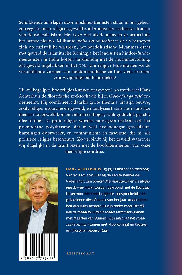 ‘Ik wil begrijpen hoe religies kunnen ontsporen’, zo motiveert Hans Achterhuis de filosofische zoektocht die hij in 'Geloof in geweld' onderneemt. Hij combineert daarbij grote thema's uit zijn oeuvre, zoals religie, utopisme en geweld, en analyseert stap voor stap hoe mensen tot geweld komen vanuit een hoger, vaak goddelijk geacht, idee of doel. De grote religies worden nauwgezet ontleed, ook het premoderne polytheïsme, dat in veel hedendaagse geweldsuit barstingen doorwerkt, en communisme en fascisme, die hij als politieke religies beschouwt. Zo verbindt hij het geweld waarover wij dagelijks in de krant lezen met de hoofdkenmerken van onze menselijke conditie.