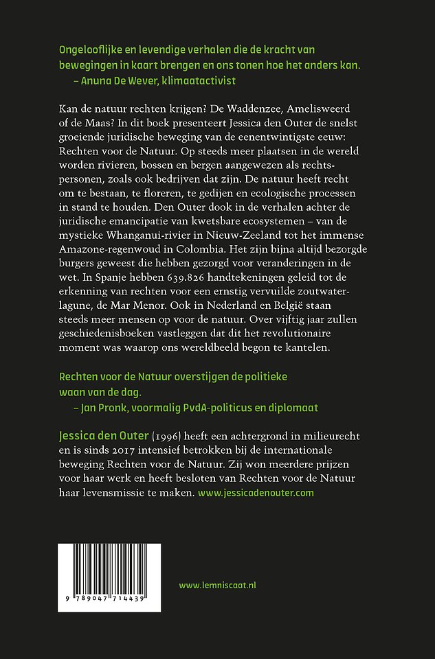 Meer over Jessica den OuterKan de natuur rechten krijgen? De Waddenzee, Amelisweerd of de Maas? In dit boek presenteert Jessica den Outer de snelst groeiende juridische beweging van de eenentwintigste eeuw: Rechten voor de Natuur. Op steeds meer plaatsen in de wereld worden rivieren, bossen en bergen aangewezen als rechtspersonen, zoals ook bedrijven dat zijn. De natuur heeft recht om te bestaan, te floreren, te gedijen en ecologische processen in stand te houden.