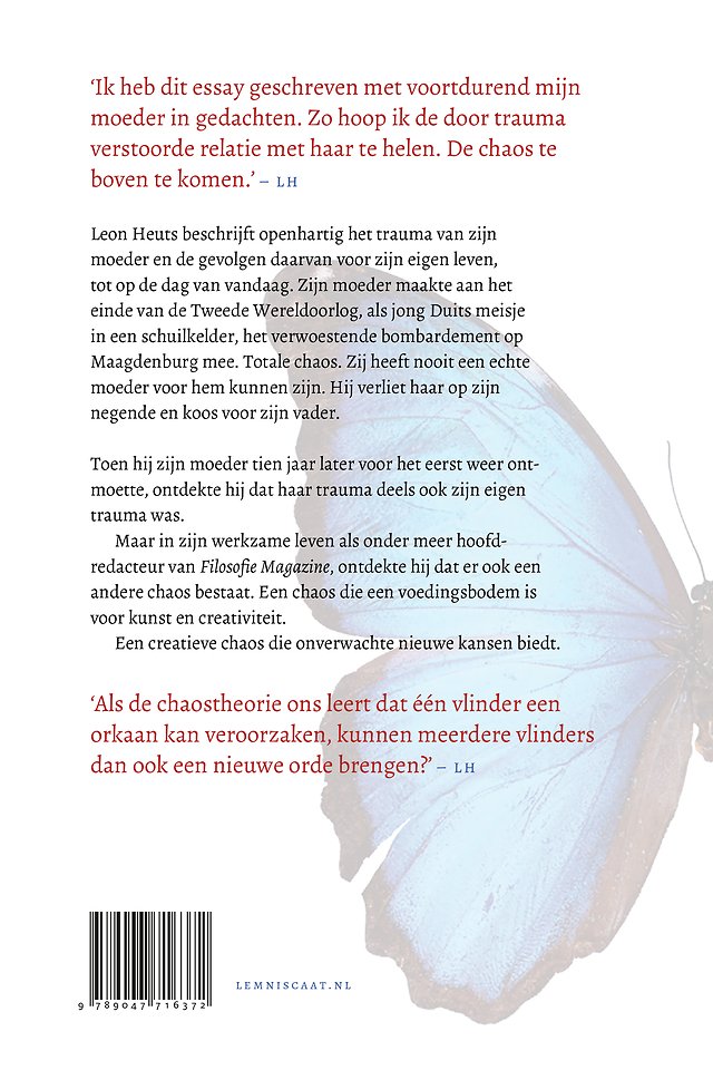 Leve de chaos is een openhartig essay van Leon Heuts over het trauma van zijn moeder en de gevolgen daarvan voor zijn eigen leven, tot op de dag van vandaag. Zijn moeder maakte aan het einde van de Tweede Wereldoorlog, als jong Duits meisje in een schuilkelder, het bombardement op Maagdenburg mee. Totale chaos. Zij heeft nooit een echte moeder voor hem kunnen zijn. Hij verliet haar op zijn negende en koos voor zijn vader. Toen hij haar tien jaar later voor het eerst weer ontmoette, was hij een punker met zwartgeverfd getoupeerd haar. Zij dronk trillend een kopje thee. Hij wilde ‘moeder’ zeggen, misschien zelfs ‘mama’, maar zijn stem stokte.