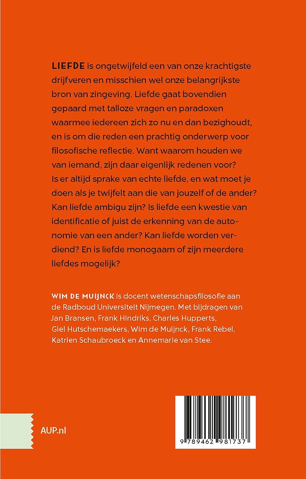 Liefde is ongetwijfeld een van onze krachtigste drijfveren en misschien wel onze belangrijkste bron van zingeving. Liefde gaat bovendien gepaard met talloze vragen en paradoxen waarmee iedereen zich zo nu en dan bezighoudt, en is om die reden een prachtig onderwerp voor filosofische reflectie. Want waarom houden we van iemand, zijn daar eigenlijk redenen voor? Is er altijd sprake van echte liefde, en wat moet je doen als je twijfelt aan die van jouzelf of de ander? Kan liefde ambigu zijn? Is liefde een kwestie van identificatie of juist de erkenning van een anders autonomie? Kan liefde verdiend worden? En is liefde monogaam of zijn meerdere liefdes mogelijk? De essays in dit boek laten zien hoe Nederlandse en Vlaamse filosofen vandaag de dag met het themabezig zijn. Onder redactie van Wim de Muijnck en met bijdragen van Jan Bransen, Frank Hindriks, Charles Hupperts, Giel Hutschemaekers, Wim de Muijnck, Frank Rebel, Katrien Schaubroeck en Annemarie van Stee.