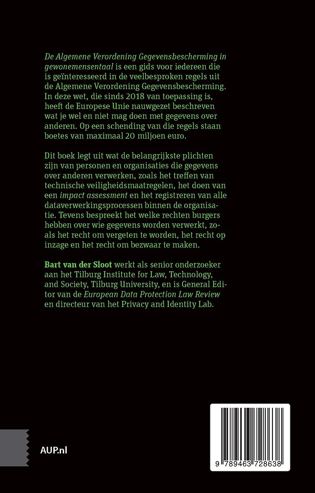 Dit boek legt uit wat de belangrijkste plichten zijn van personen en organisaties die gegevens over anderen verwerken, zoals het treffen van technische veiligheidsmaatregelen, het doen van een impact assessment en het registreren van alle dataverwerkingsprocessen binnen de organisatie. Tevens bespreekt het welke rechten burgers hebben over wie gegevens worden verwerkt, zoals het recht om vergeten te worden, het recht op inzage en het recht om bezwaar te maken