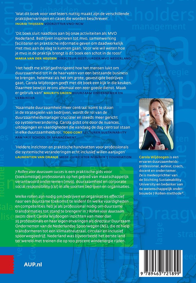 In '7 Rollen voor duurzaam succes' deelt Carola Wijdoogen inzichten van meer dan 25 professionals en haar eigen ervaringen als directeur Duurzaam Ondernemen van de Nederlandse Spoorwegen (NS), die ze hielp transformeren tot een klimaatneutraal, circulair en inclusief spoorwegbedrijf; Nederland was bijvoorbeeld het eerste land ter wereld met treinen die op 100 procent windenergie rijden.