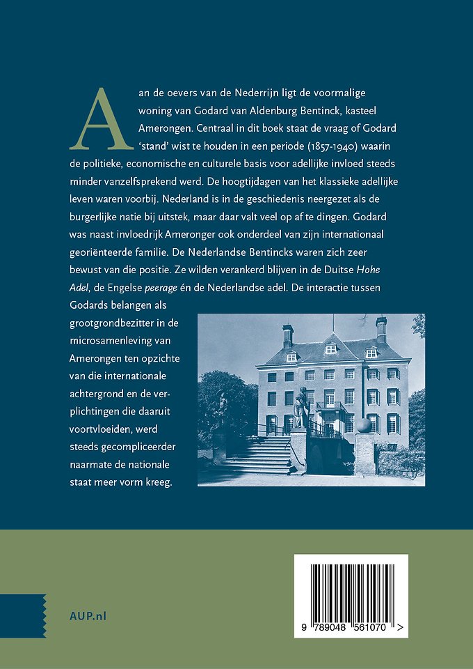 Aan de oevers van de Nederrijn ligt de voormalige woning van Godard van Aldenburg Bentinck, kasteel Amerongen. Centraal in dit boek staat de vraag of Godard ‘stand’ wist te houden in een periode (1857-1940) waarin de politieke, economische en culturele basis voor adellijke invloed steeds minder vanzelfsprekend werd. De hoogtijdagen van het klassieke adellijke leven waren voorbij. Nederland is in de geschiedenis neergezet als de burgerlijke natie bij uitstek, maar daar valt veel op af te dingen. Godard was naast invloedrijk Ameronger ook onderdeel van zijn internationaal georiënteerde familie. De Nederlandse Bentincks waren zich zeer bewust van die positie. Ze wilden verankerd blijven in de Duitse ‘Hohe adel’, de Engelse peerage én de Nederlandse adel. De interactie tussen Godards belangen als grootgrondbezitter in de microsamenleving van Amerongen ten opzichte van die internationale achtergrond en de verplichtingen die daaruit voortvloeiden, werd steeds gecompliceerder naarmate de nationale staat meer vorm kreeg.