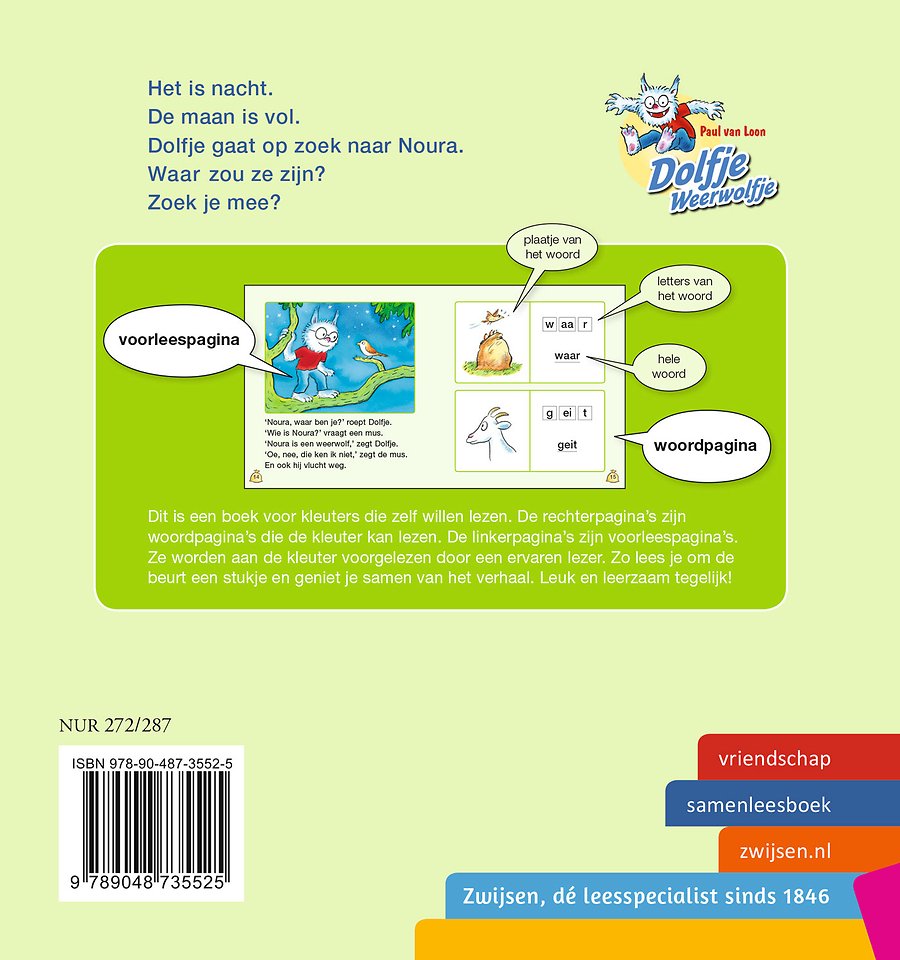 AVI-lezen met Paul van Loon waar is noura? Een Paul van Loon voor kleuters! De rechterpagina’s zijn woordpagina’s die de kleuter leest. De linkerpagina’s zijn voorleespagina’s voor de ervaren lezer. Ga er eens lekker voor zitten en lees gezellig samen in dit Dolfje Weerwolfje samenleesboek! Het is nacht. De maan is vol. Dolfje gaat op zoek naar Noura. Waar zou ze zijn? Hij vraagt het muis, kat en uil. Maar niemand heeft Noura gezien. Zoek je mee?