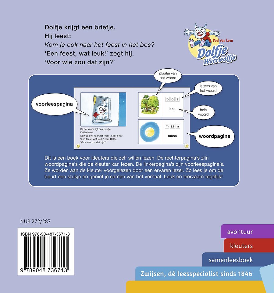 Een Paul van Loon voor kleuters! De rechterpagina’s van dit Dolfje Weerwolfje samenleesboek zijn woordpagina's die de kleuter zelf leest. De linkerpagina's zijn voorleespagina's voor de ervaren lezer. Ga er eens lekker voor zitten en lees gezellig samen over Dolfje, zijn vriendinnetje Noura en het feest in het bos.