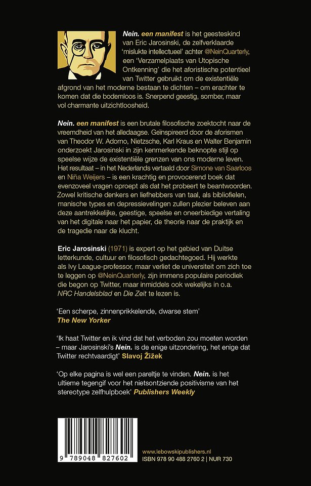 Nein. een manifest is het geesteskind van Eric Jarosinski, de zelfverklaarde 'mislukte intellectueel' achter @NeinQuarterly, een 'Verzamelplaats van Utopische Ontkenning' die het aforistische potentieel van Twitter gebruikt om de existentiële afgrond van het moderne bestaan te dichten - om erachter te komen dat die bodemloos is. Snerpend geestig, somber, maar vol charmante uitzichtloosheid.