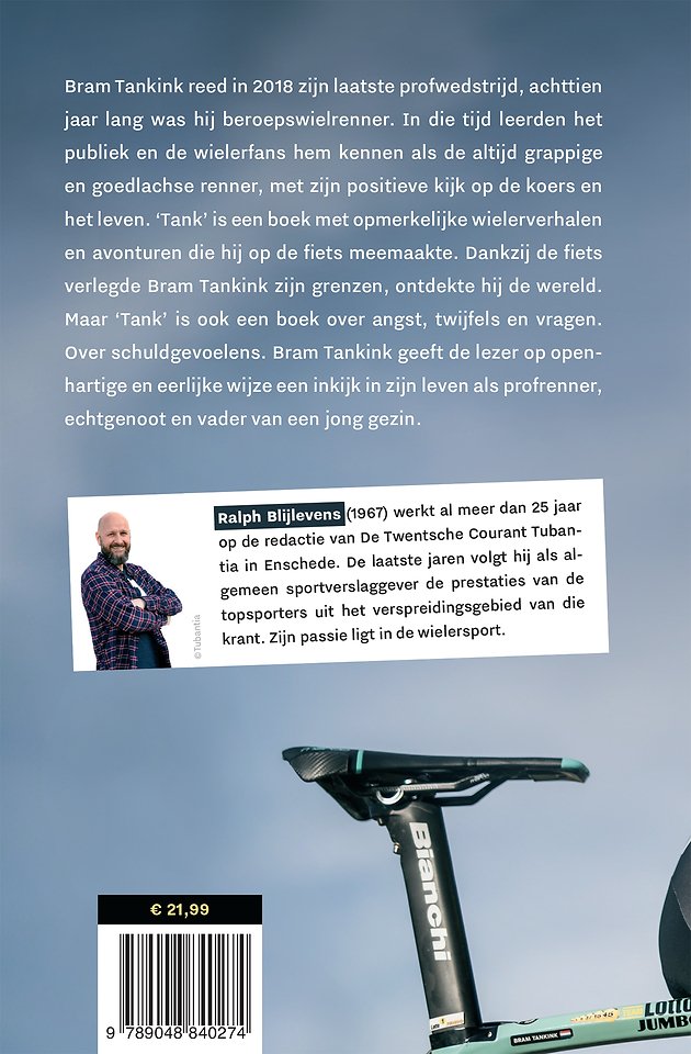 Bram Tankink reed in 2018 zijn laatste profwedstrijd, achttien jaar lang was hij beroepswielrenner. In die tijd leerden het publiek en de wielerfans hem kennen als de altijd grappige en goedlachse renner, met zijn positieve kijk op de koers en het leven. 'Tank' is een boek met opmerkelijke wielerverhalen en avonturen die hij op de fiets meemaakte. Dankzij de fiets verlegde Bram Tankink zijn grenzen, ontdekte hij de wereld. Maar 'Tank' is ook een boek over angst, twijfels en vragen. Over schuldgevoelens. Bram Tankink geeft de lezer op openhartige en eerlijke wijze een inkijk in zijn leven als profrenner, echtgenoot en vader van een jong gezin.