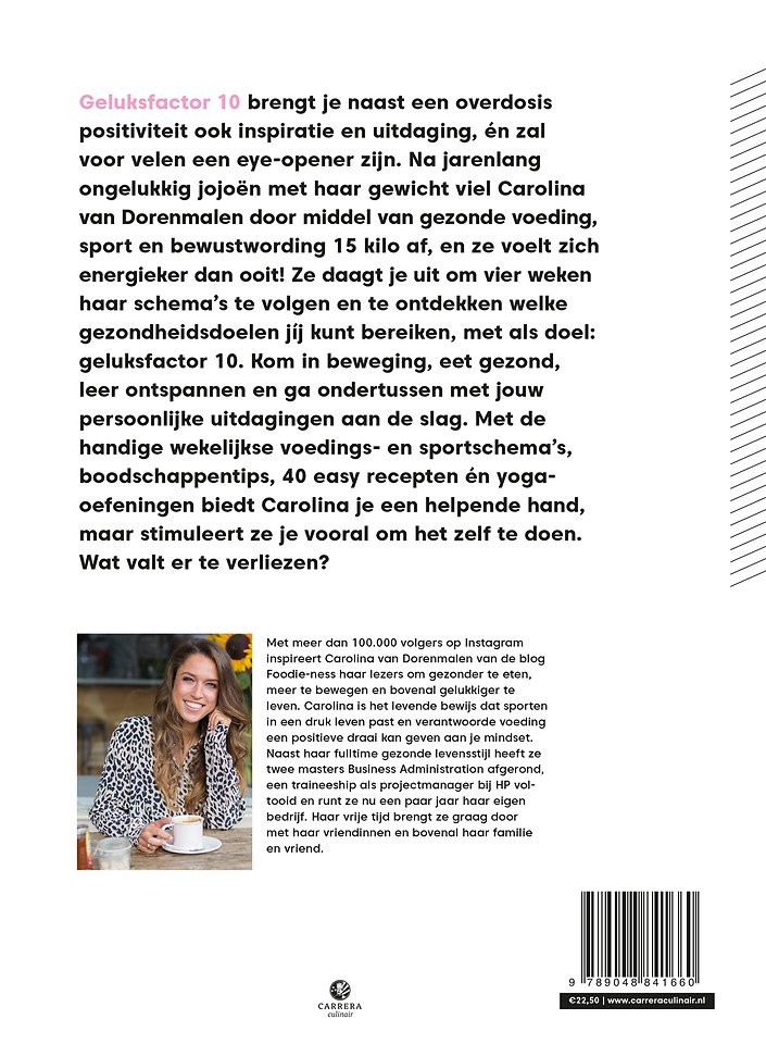 Geluksfactor 10 brengt je naast een overdosis positiviteit ook inspiratie en uitdaging, én zal voor velen een eye-opener zijn. Na jarenlang ongelukkig jojoën met haar gewicht viel Carolina van Dorenmalen door middel van gezonde voeding, sport en bewustwording 15 kilo af, en ze voelt zich energieker dan ooit! Ze daagt je uit om vier weken haar schema's te volgen en te ontdekken welke gezondheidsdoelen jíj kunt bereiken, met als doel: geluksfactor 10. Kom in beweging, eet gezond, leer ontspannen en ga ondertussen met jouw persoonlijke uitdagingen aan de slag. Met de handige wekelijkse voedings- en sportschema's, boodschappentips, 40 easy recepten én yoga-oefeningen biedt Carolina je een helpende hand, maar stimuleert ze je vooral om het zelf te doen. Wat valt er te verliezen?