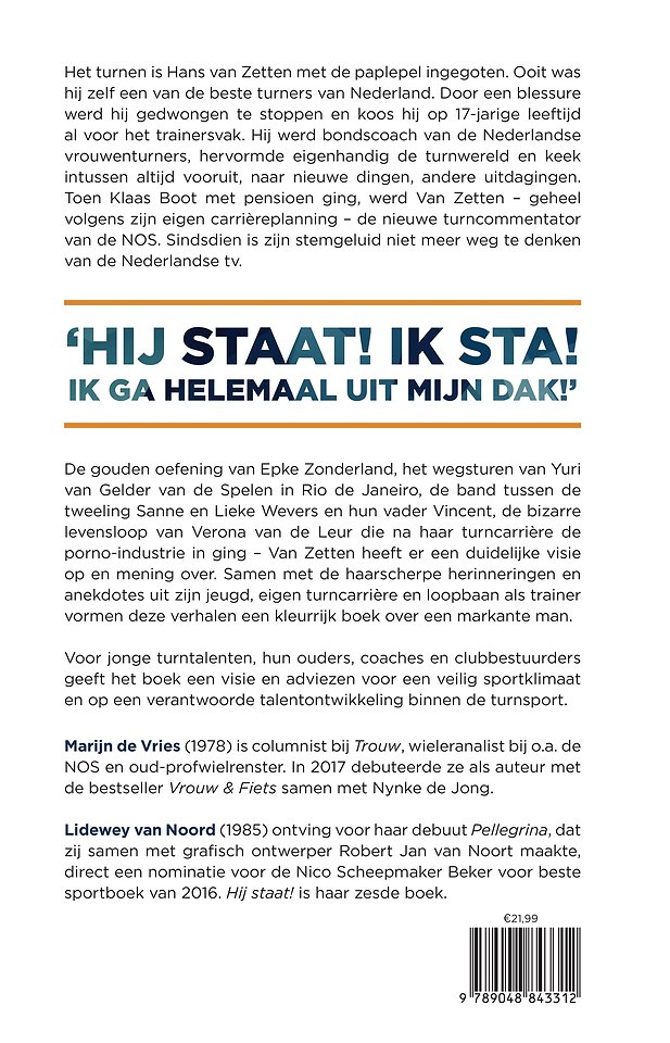 Het turnen is Hans van Zetten met de paplepel ingegoten. Ooit was hij zelf een van de beste turners van Nederland. Door een blessure werd hij gedwongen te stoppen en koos hij op 17-jarige leeftijd al voor het trainersvak. Hij werd bondscoach van de Nederlandse vrouwenturners, hervormde eigenhandig de nationale vrouwenturnwereld en keek intussen altijd vooruit, naar nieuwe dingen, andere uitdagingen. Toen Klaas Boot met pensioen ging, werd Van Zetten - geheel volgens zijn eigen carrièreplanning - de nieuwe turncommentator van de NOS. Sindsdien is zijn stemgeluid niet meer weg te denken van de Nederlandse tv.