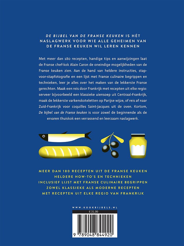 Met meer dan 180 recepten, handige tips en aanwijzingen laat de Franse chef-kok Alain Caron de oneindige mogelijkheden van de Franse keuken zien. Aan de hand van heldere instructies, stap-voor-stapfotografie en een lijst met Franse culinaire begrippen en technieken, leer je alles over het maken van de lekkerste Franse gerechten. Maak een reis door Frankrijk met recepten uit elke regio: serveer bijvoorbeeld een klassieke uiensoep uit Centraal-Frankrijk, maak de lekkerste varkenskoteletten op Parijse wijze, of reis af naar Zuid-Frankrijk voor coquilles Saint-Jacques uit de oven. Kortom, De bijbel van de Franse keuken is voor zowel de beginnende als de ervaren thuiskok een verrassend en leerzaam naslagwerk.