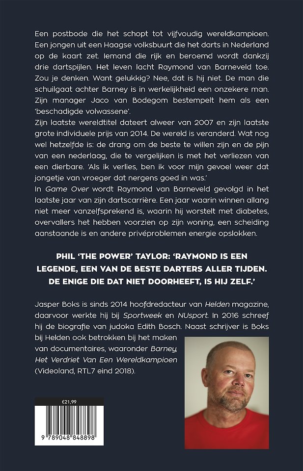 Een postbode die het schopt tot vijfvoudig wereldkampioen. Een jongen uit een Haagse volksbuurt die het darts in Nederland op de kaart zette. Iemand die rijk en beroemd wordt dankzij drie dartspijlen. Waar hij komt, schalt het 'Barney Army' door de zaal. Het leven lacht Raymond van Barneveld toe. Zou je denken. Want gelukkig? Nee, dat is hij niet. De man die schuilgaat achter Barney is in werkelijkheid een depressieve, onzekere man. Iemand die volgens zijn ex-vrouw Silvia zichzelf de afgelopen jaren flink is kwijtgeraakt. 'Ik betwijfel of zijn kwelgeesten hem ooit met rust laten.' Zijn manager Jaco bestempeld hem als een 'beschadigde volwassene'. Zijn grote rivaal Phil 'The Power' Taylor zegt: 'Raymond is een legende, een van de beste darters aller tijden. De enige die dat niet door heeft, is hij zelf.'