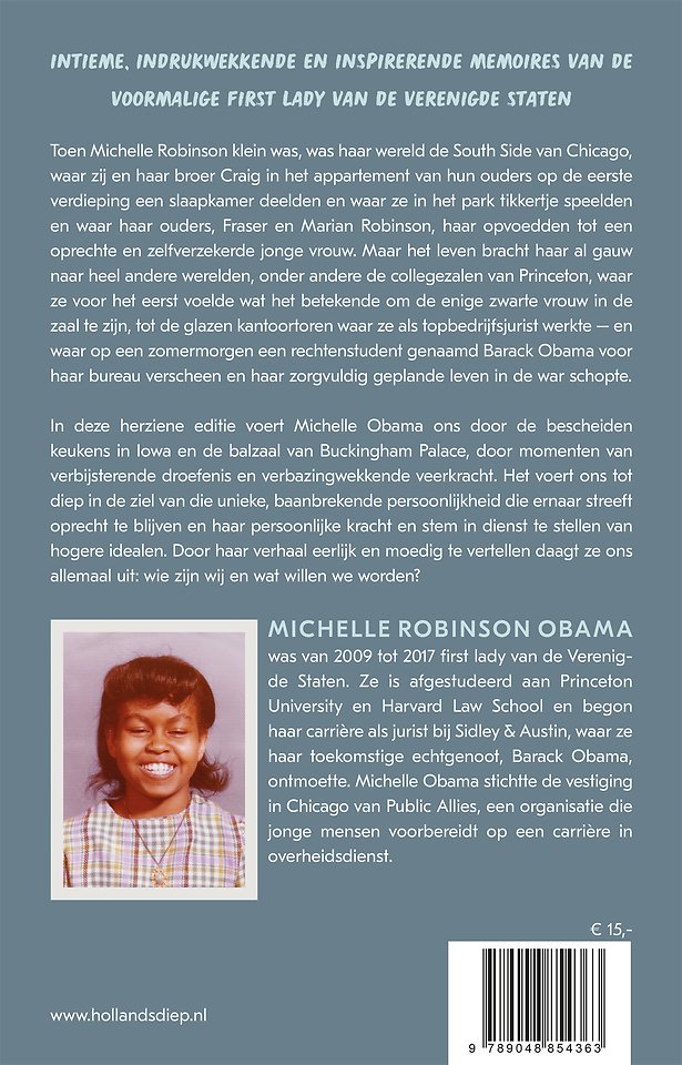 Toen Michelle Robinson klein was, was haar wereld de South Side van Chicago, waar zij en haar broer Craig in het appartement van hun ouders op de eerste verdieping een slaapkamer deelden en waar ze in het park tikkertje speelden en waar haar ouders, Fraser en Marian Robinson, haar opvoedden tot een oprechte en zelfverzekerde jonge vrouw. Maar het leven bracht haar al gauw naar heel andere werelden, onder andere de collegezalen van Princeton, waar ze voor het eerst voelde wat het betekende om de enige zwarte vrouw in de zaal te zijn, tot de glazen kantoortoren waar ze als topbedrijfsjurist werkte - en waar op een zomermorgen een rechtenstudent genaamd Barack Obama voor haar bureau verscheen en haar zorgvuldig geplande leven in de war schopte.