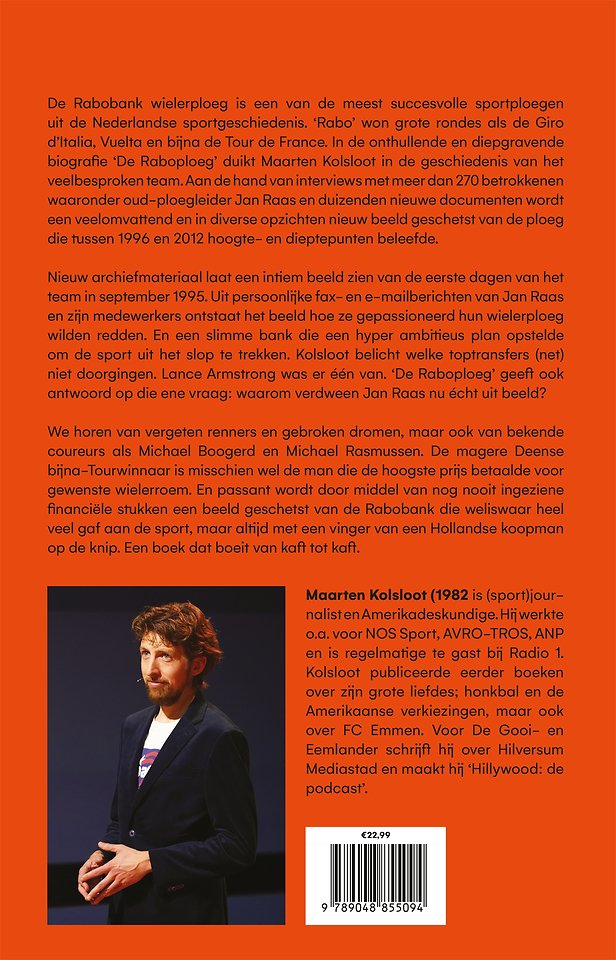 De Rabobank wielerploeg is een van de meest succesvolle sportploegen uit de Nederlandse sportgeschiedenis. 'Rabo' won grote rondes als de Giro D'Italia, Vuelta en bijna de Tour de France. In de onthullende en diepgravende biografie 'De Raboploeg' duikt Maarten Kolsloot in de geschiedenis van het veelbesproken team. Aan de hand van interviews met 200 betrokkenen en duizenden nieuwe documenten wordt een veelomvattend en in diverse opzichten nieuw beeld geschetst van de ploeg die tussen 1996 en 2012 successen boekte.