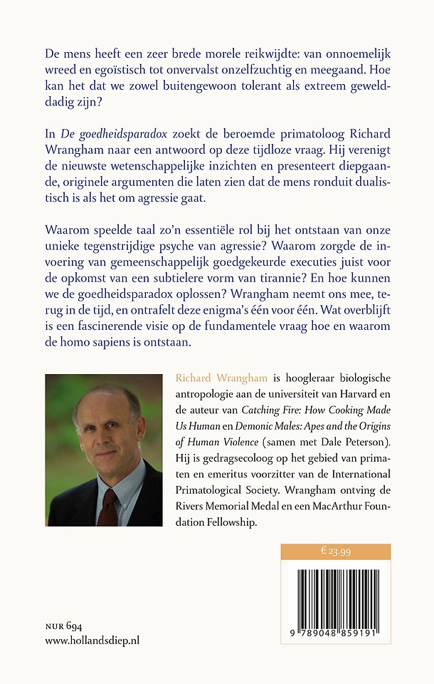 In 'De goedheidsparadox' presenteert de beroemde primatoloog Richard Wrangham een opvallend originele theorie om de tijdloze vraag te beantwoorden 'hoe' en 'waarom' de homo sapiens is ontstaan.