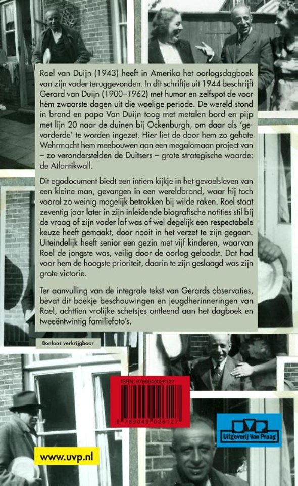 Roel van Duijn (1943) heeft in Amerika het oorlogsdagboek van zijn vader teruggevonden. In dit schriftje uit 1944 beschrijft Gerard van Duijn (1900-1962) met humor en zelfspot de voor hém zwaarste dagen uit die woelige periode. De wereld stond in brand en papa Van Duijn toog met metalen bord en pijp met lijn 20 naar de duinen bij Ockenburgh, om daar als 'gevorderde' te worden ingezet. Hier liet de door hem zo gehate Wehrmacht hem meebouwen aan een megalomaan project van - zo veronderstelden de Duitsers - grote strategische waarde: de Atlantikwall.