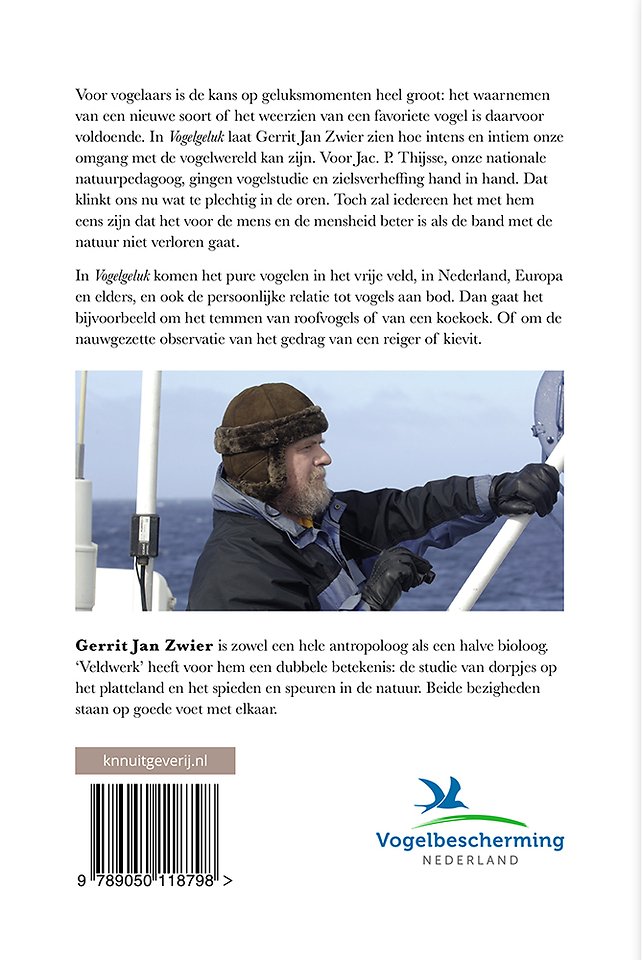Voor vogelaars is de kans op geluksmomenten heel groot: het waarnemen van een nieuwe soort of het weerzien van een favoriete vogel is daarvoor voldoende. In Vogelgeluk laat Gerrit Jan Zwier zien hoe intens en intiem onze omgang met de vogelwereld kan zijn. Voor Jac. P. Thijsse, onze nationale natuurpedagoog, gingen vogelstudie en zielsverheffing hand in hand. Dat klinkt ons nu wat te plechtig in de oren. Toch zal iedereen het met hem eens zijn dat het voor de mens en de mensheid beter is als de band met de natuur niet verloren gaat.