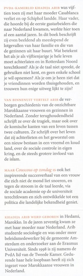 Maar Couscous op zondag is ook het inspirerende succesverhaal van een vrouw die zich niet de mond liet snoeren, en tegen de stroom in de taal leerde, via de sociale academie op de universiteit terechtkwam en zich ontwikkelde tot een politica die landelijke bekendheid geniet.