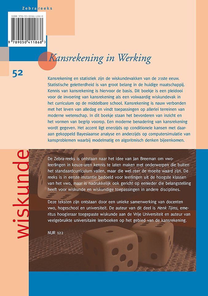 Kansrekening en statistiek zijn de wiskundevakken van de 21ste eeuw. Statistische geletterdheid is van groot belang in de huidige maatschappij. Kennis van kansrekening is hiervoor de basis. Dit boekje is een pleidooi voor de invoering van kansrekening als een volwaardig wiskundevak in het curriculum op de middelbare school. Kansrekening is nauw verbonden met het leven van alledag en vindt toepassingen op allerlei terreinen van moderne wetenschap. In dit boekje staan het bevorderen van inzicht en het vormen van begrip voorop. Een moderne benadering van kansrekening wordt gegeven. Het accent ligt enerzijds op conditionele kansen met daaraan gekoppeld Bayesiaanse analyse en anderzijds op computersimulatie van kansproblemen waarbij modelmatig en algoritmisch denken bijeenkomen.