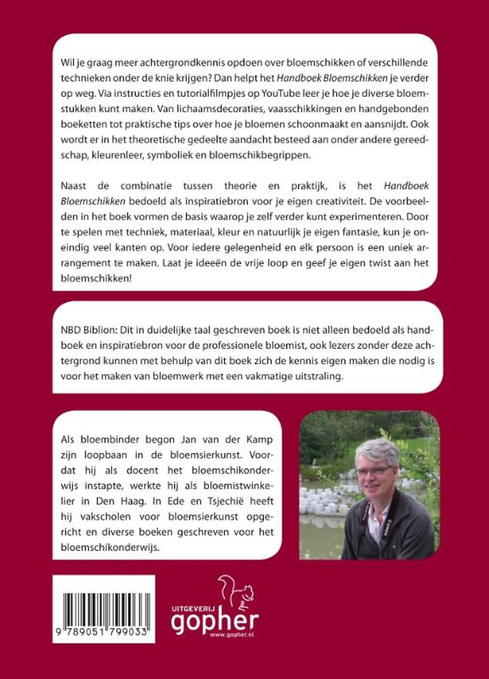 Wil je graag meer achtergrondkennis opdoen over bloemschikken of verschillende technieken onder de knie krijgen? Dan helpt het 'Handboek Bloemschikken' je verder op weg. Via instructies en tutorialfilmpjes op YouTube leer je hoe je diverse bloemstukken kunt maken. Van lichaamsdecoraties, vaasschikkingen en handgebonden boeketten tot praktische tips over hoe je bloemen schoonmaakt en aansnijdt. Ook wordt er in het theoretische gedeelte aandacht besteed aan onder andere gereedschap, kleurenleer, symboliek en bloemschikbegrippen.