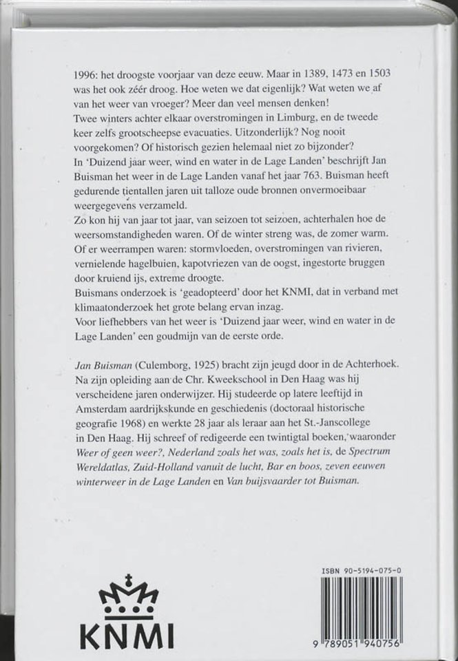 In 'Duizend jaar weer, wind, en water in de Lage Landen' geeft Jan Buisman een indrukwekkend en zeer gedetailleerd overzicht van het weer in de noordelijke en zuidelijke Nederlanden vanaf het jaar 763. Op grond van een enorme hoeveelheid zeer verschillende bronnen reconstrueert hij het weer van jaar tot jaar. Daarmee levert hij niet alleen het KNMI (dat het project wetenschappelijk begeleidt) belangrijke informatie, maar hij geeft iedere historisch geïnteresseerde een totaal nieuwe kijk op de geschiedenis. Er is immers niets dat het dagelijkse leven zo bepaalt en kleurt als het weer. Maar ook grote historische gebeurtenissen als de Slag bij Nieuwpoort en de Franse Revolutie zouden anders verlopen zijn bij ander weer.