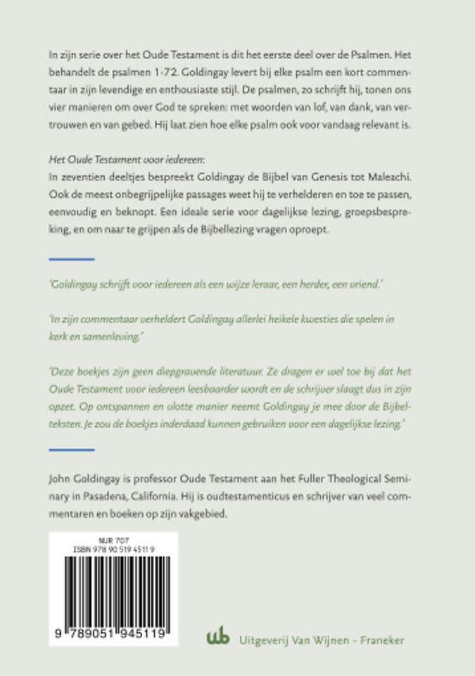 In zijn serie over het Oude Testament geeft Goldingay in twee boeken over de psalmen bij elke psalm een kort commentaar in zijn levendige en enthousiaste stijl. De psalmen, zo schrijft hij, laten ons vier manieren zien om over God te spreken: met woorden van lof, van dank, van vertrouwen en van gebed. Hij laat zien hoe elke psalm ook voor vandaag relevant kan zijn.