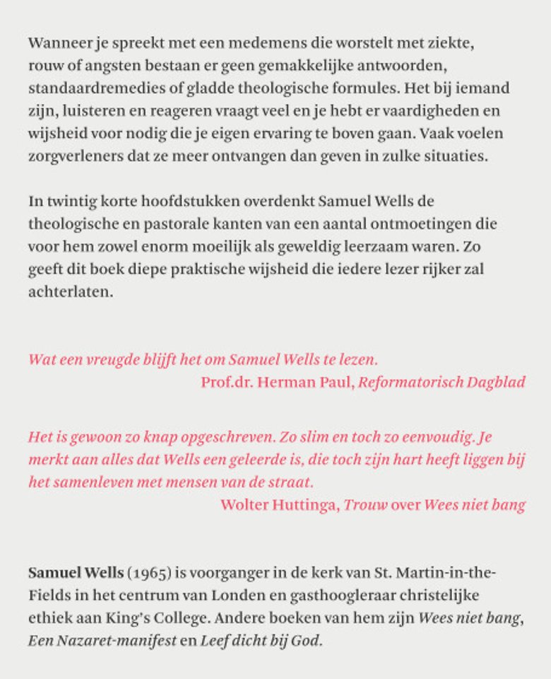 dat ze meer ontvangen dan geven in zulke ontmoetingen. In twintig korte hoofdstukken overdenkt Samuel Wells de theologische en pastorale kanten van zulke ontmoetingen, die voor hem zowel enorm moeilijk als geweldig leerzaam waren. Zo geeft dit boek diepe praktische wijsheid en inzicht die iedere lezer rijker zal achterlaten.