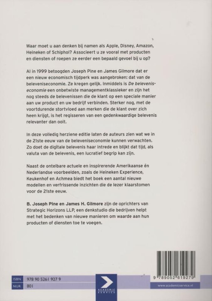 Al in 1999 betoogden Joseph Pine en James Gilmore dat er een nieuw economisch tijdperk was aangebroken: dat van de beleveniseconomie. Ze kregen gelijk. Inmiddels is 'De beleveniseconomie' een onbetwiste managementklassieker en zijn het nog steeds de belevenissen die de klant op een speciale manier aan uw product en uw bedrijf verbinden. Sterker nog, met de voortdurende stortvloed aan merken die de klant over zich heen krijgt, is het regisseren van een gedenkwaardige belevenis relevanter dan ooit.