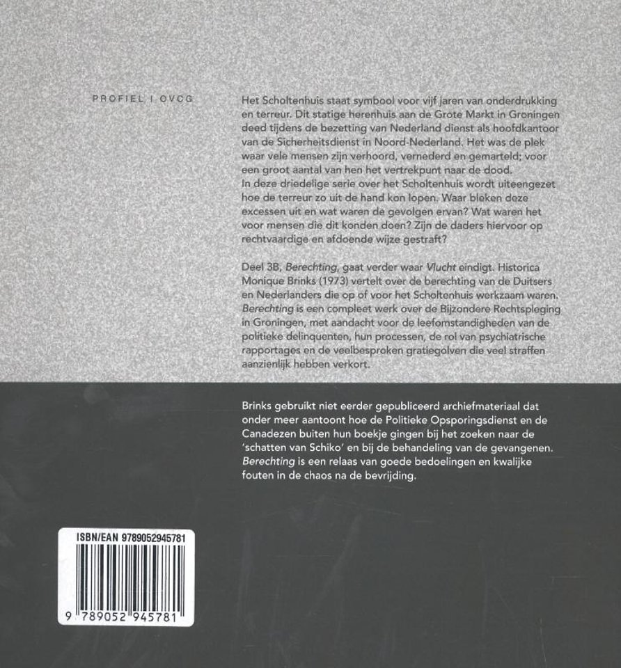 Deel 3B, Berechting, gaat verder waar Vlucht eindigt. Historica Monique Brinks (1973) vertelt over de berechting van de Duitsers en Nederlanders die op of voor het Scholtenhuis werkzaam waren. Berechting is een compleet werk over de Bijzondere Rechtspleging in Groningen, met aandacht voor de leefomstandigheden van de politieke delinquenten, hun processen, de rol van psychiatrische rapportages en de veelbesproken gratiegolven die veel straffen aanzienlijk hebben verkort. Brinks gebruikt niet eerder gepubliceerd archiefmateriaal dat onder meer aantoont hoe de Politieke Opsporingsdienst en de Canadezen buiten hun boekje gingen bij het zoeken naar de 'Schatten van Schiko' en bij de behandeling van de gevangenen. Berechting is een relaas van goede bedoelingen en kwalijke fouten in de chaos na de bevrijding.