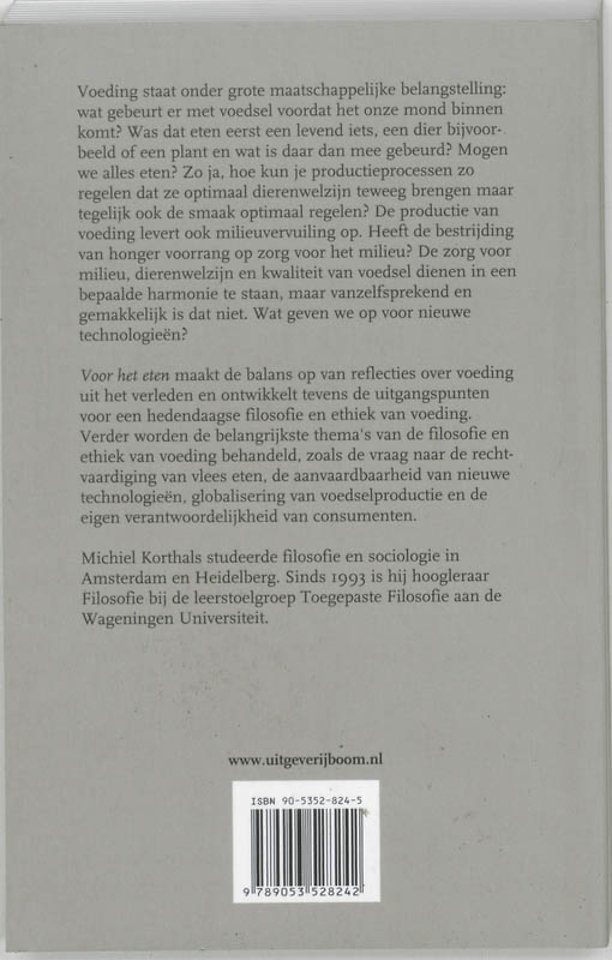 Wat is goed eten, goed produceren, goed leven? "Voor het eten" maakt de balans op van reflecties over voeding uit het verleden en ontwikkelt tevens de uitgangspunten voor een hedendaags denken over voeding. Verder worden de belangrijkste thema's van de filosofie en ethiek van voeding behandeld, zoals de vraag naar de rechtvaardiging van vlees eten, de aanvaardbaarheid van nieuwe technologieën, mondialisering van voedselproductie en de eigen verantwoordelijkheid van consumenten.